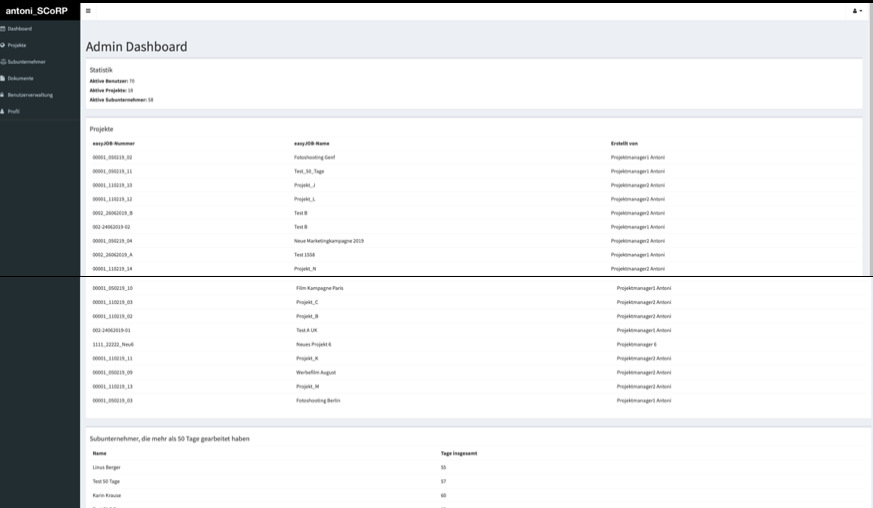 SCoRP bietet Ihnen die Möglichkeit einer übergreifenden Suche. Treffer werden nach Projekten, Nutzern und Subunternehmern übersichtlich geclustert.